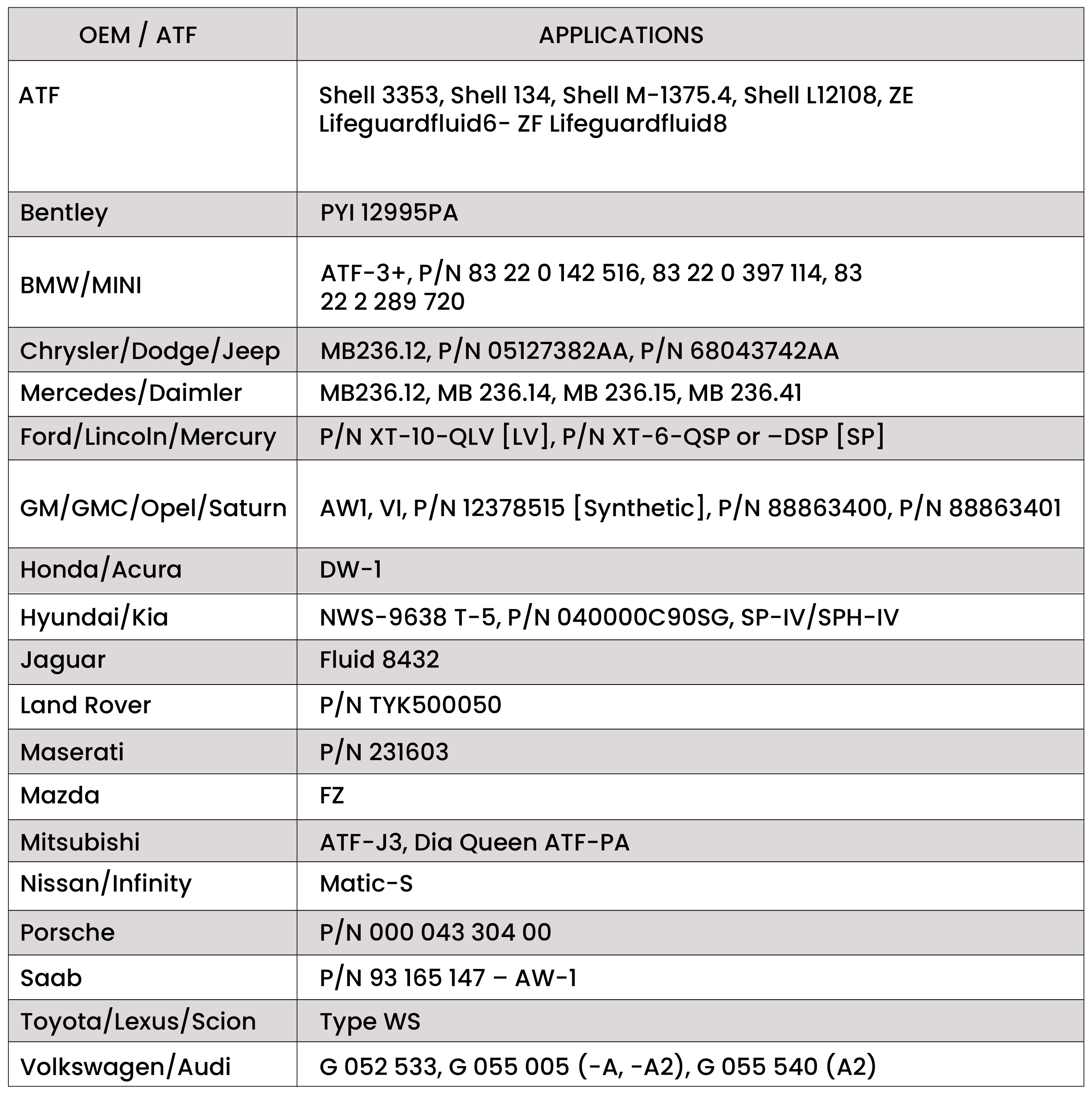 * Not Recommended for Continuously Variable Transmissions (CVT)