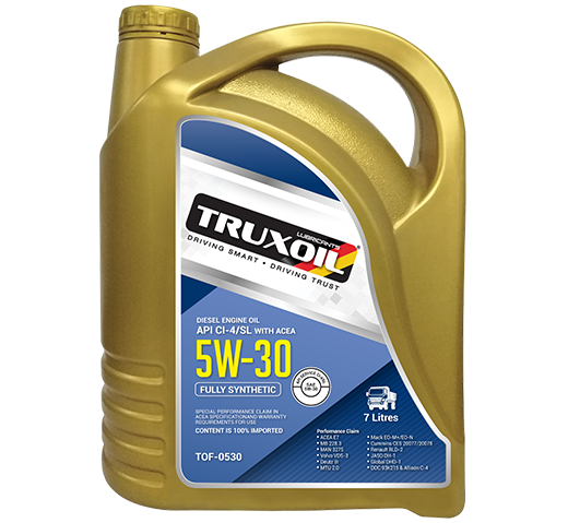 TRUXOIL TOF-0530 Fully Synthetic Diesel Engine Oil SAE 5W/30 API CI-4/SL with ACEA E7 is a new generation synthetic diesel engine oil specially formulated from Hydroc- racked Base oil to provide exceptionally smooth and powerful performance. This fully synthetic diesel engine oil has been designed with Western European needs in mind where ACEA E7 requirements are dominating, It is developed With advanced additives technology to deliver maximum protection for Diesel Engine under extreme operating conditions.