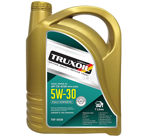TRUXOIL TKF-0530 is a high premium fully synthetic diesel engine oil has special performance claim in CK-4, CK-4/SN, CJ-4, CI-4 PLUS, Cummins CES 20086, Detroit Diesel DFS93K222, Mack EO-S-4.5, Volvo VDS-4.5, CAT ECF-3, FORD WSS-M2C171-F1, ACEA E9-16 (2016), MB-Approval 228.31, Renault Truck RLD-4, MTU Type 2.1 & Deutz DQC III-10 LA. It meets most of the engine manufacturer specification and warranty requirements for use.