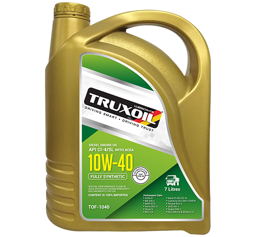 TRUXOIL TOF-1040 Fully Synthetic Diesel Engine Oil SAE 10W/40 API CI-4/SL with ACEA E7 is a new generation synthetic diesel engine oil specially formulated from Hydrocracked Base oil to provide exceptionally smooth and powerful performance. This fully synthetic diesel engine oil has been designed with Western European needs in mind where ACEA E7 requirements are dominating. It is developed with advanced additives technology to deliver maximum protection for Diesel Engine under extreme operating conditions.